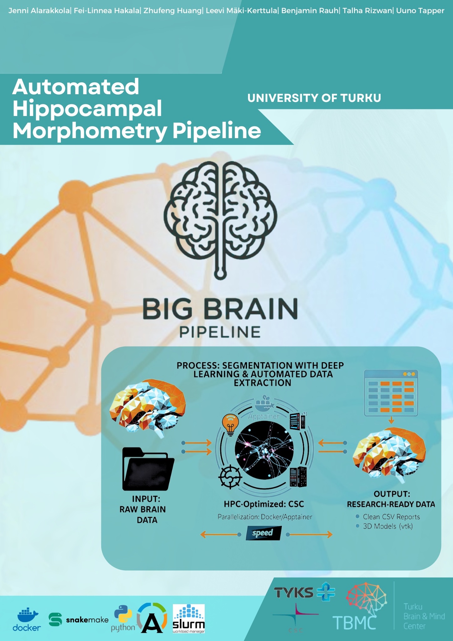 Team Big Brain introduces an automated, high-performance computing pipeline designed for Turku Brain Bank. By leveraging deep learning and CSC’s supercomputing infrastructure, the tool segments the hippocampus into 12 regions from raw MRI scans in under 10 minutes per subject. Featuring a checkpoint system that restarts in case of failure and standardized CSV outputs, the pipeline transforms massive medical datasets into research-ready radiomic features that will be used by the researchers.